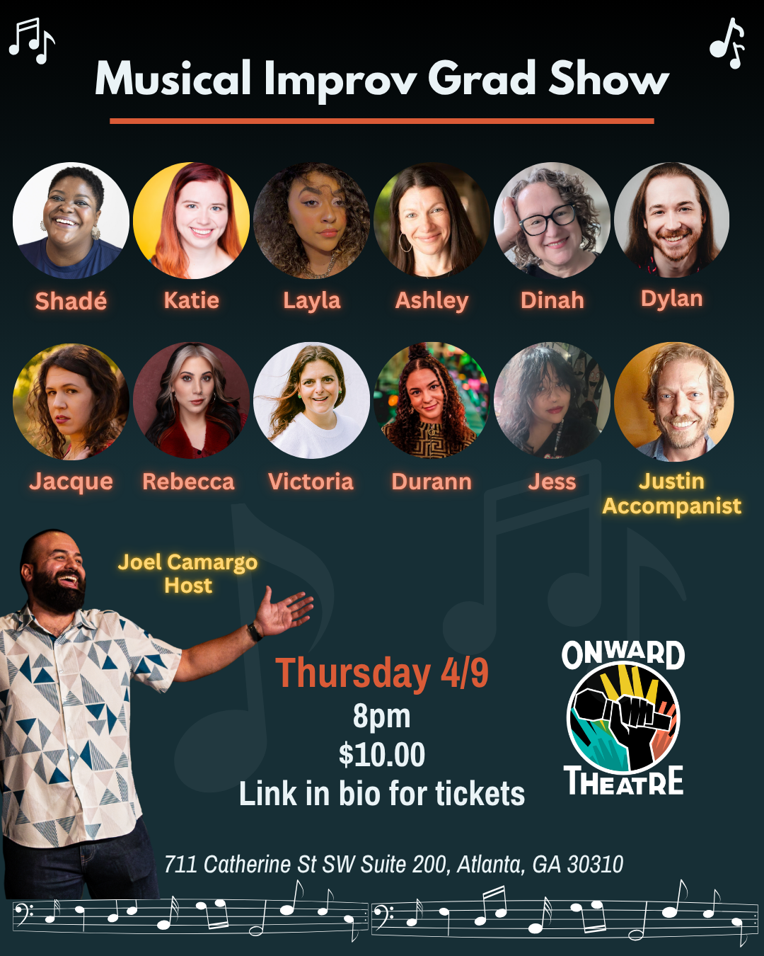 - Doors open at 7:45 - Please note there are three flights of stairs up to the Onward Theatre Community Collaborative at Academy Lofts - BYOB - Please Park on Mayland St. or Catherine Street - There is signage directing you to the Onward Theatre Space, please use the entrance off Mayland Street - Onward will have water, soft drinks, and light snacks for sale
